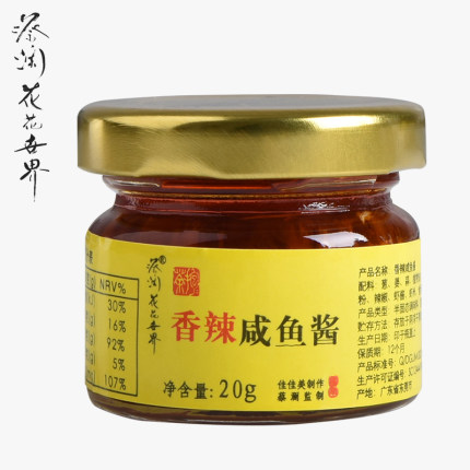 品牌名稱:蔡瀾花花世界 產品參數: 生產許可證編號:SC12444190000396廠名:東莞市佳佳美食品有限公司廠址:東莞市道滘鎮振興北二路22號廠家聯繫方式:88313818配料表:詳見標籤保質期:360 天食品添加劑:無淨含量: 20g包裝方式: 包裝品牌: 蔡瀾花花世界系列: 香辣鹹魚醬規格: 20g嚐鮮裝產地: 中國大陸省份: 廣東省城市: 東莞市 產品購買連結: 蔡瀾花花世界天貓店